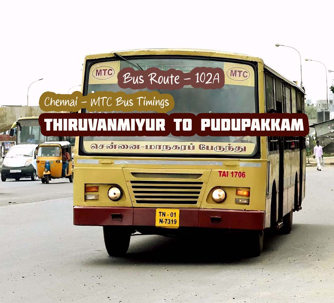 Thiruvanmiyur to Pudupakkam bus timings and 102A bus timings are updated here with the latest Chennai MTC bus timings, including all stops, departure times, distance, travel time, and fare details. The Chennai Metropolitan Transport Corporation (MTC) 102A bus route runs from Thiruvanmiyur to Pudupakkam via Shozhanganallur. Scroll down to view complete Thiruvanmiyur to Pudupakkam bus timings and MTC 102A bus route details.